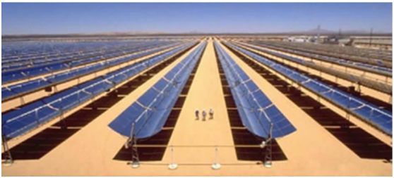 (1)槽式線聚焦系統(tǒng):采用長槽型拋物柱面聚焦系統(tǒng),將若干倍軸向兩側(cè)面積上的太陽輻射能,聚焦在系統(tǒng)焦線上的小范圍,形成高能量密度的太陽輻射能,用于加熱焦線管道中的導(dǎo)熱油或融熔鹽載熱工質(zhì);再將獲得高溫的工質(zhì),輸送往蒸汽發(fā)生器加熱軟水,從而獲取過熱蒸汽;最后利用過熱蒸汽推動汽輪發(fā)電機(jī)組發(fā)電。槽型拋物柱面聚焦系統(tǒng)按東西方向布陣安裝,只需跟蹤南北一個(gè)方向上每月8°左右的太陽位移,就可達(dá)到聚焦加熱工質(zhì)的目的。但因?yàn)樵撔拖到y(tǒng)的幾何聚光比不是很高,焦線加熱溫度一般只在260°C ~ 570°C之間,而且工質(zhì)輸送路線太長,高溫工質(zhì)的熱損較大,故熱發(fā)電效率不是很高。