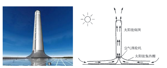 圖6. 13太陽能熱煙囪發(fā)電(照片及原理示意圖